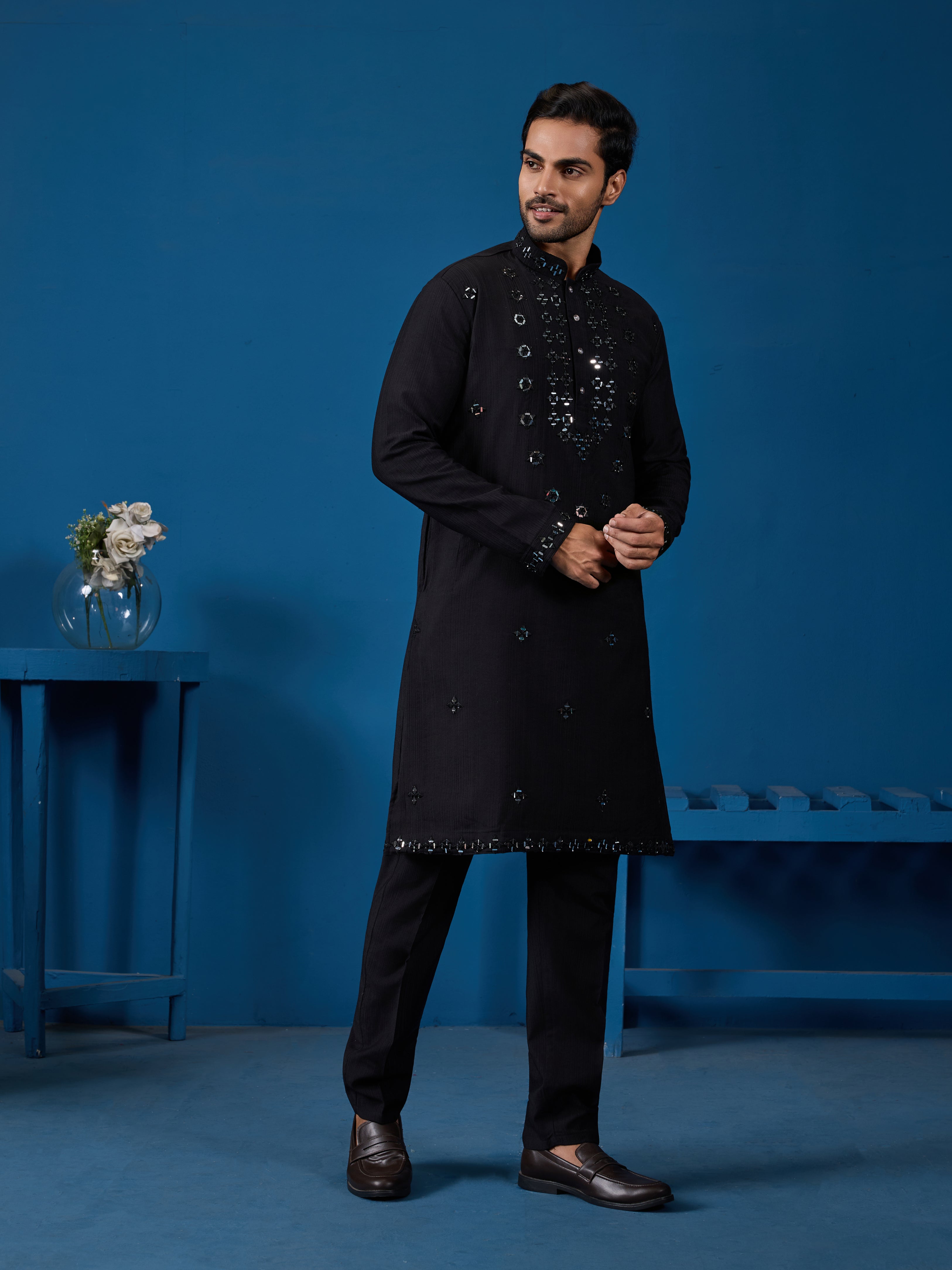 This Black Mirror Work Kurta Pant Wedding Outfits for Mens Combines Traditional Craftsmanship With a Modern Fit, Ensuring Comfort Throughout Long Functions and Ceremonies.