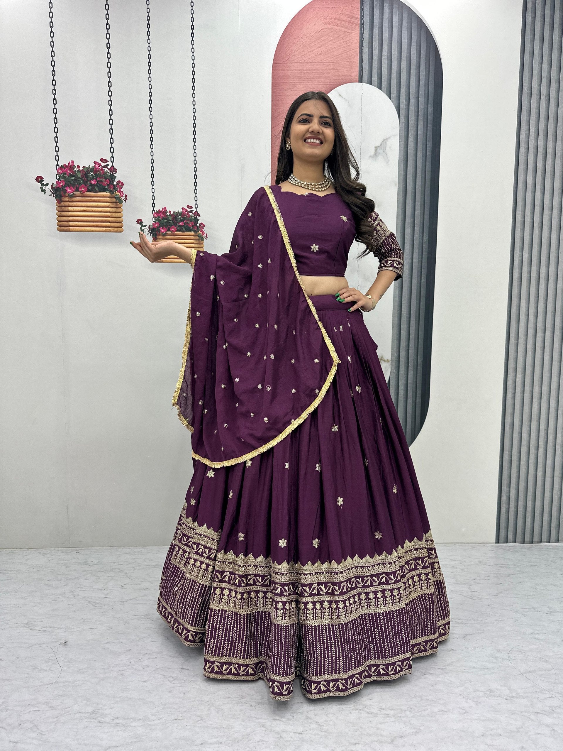 Make a regal statement with our Luxury Purple Embroidered Lehenga Set, thoughtfully crafted to embody royal elegance and timeless Indian craftsmanship. Drenched in a rich purple hue, this lehenga set is adorned with intricate embroidery that adds depth, shimmer, and refined sophistication to every detail.