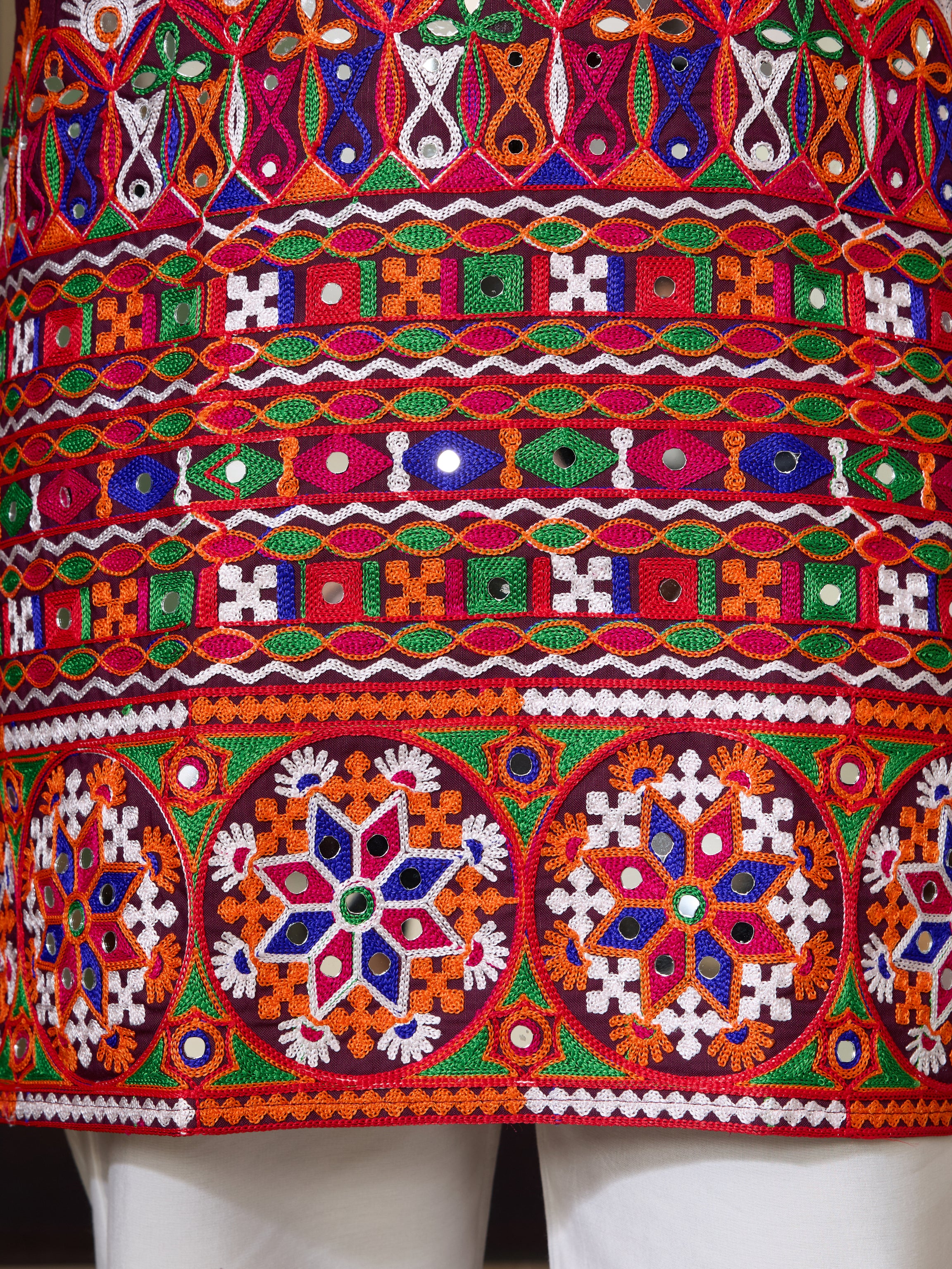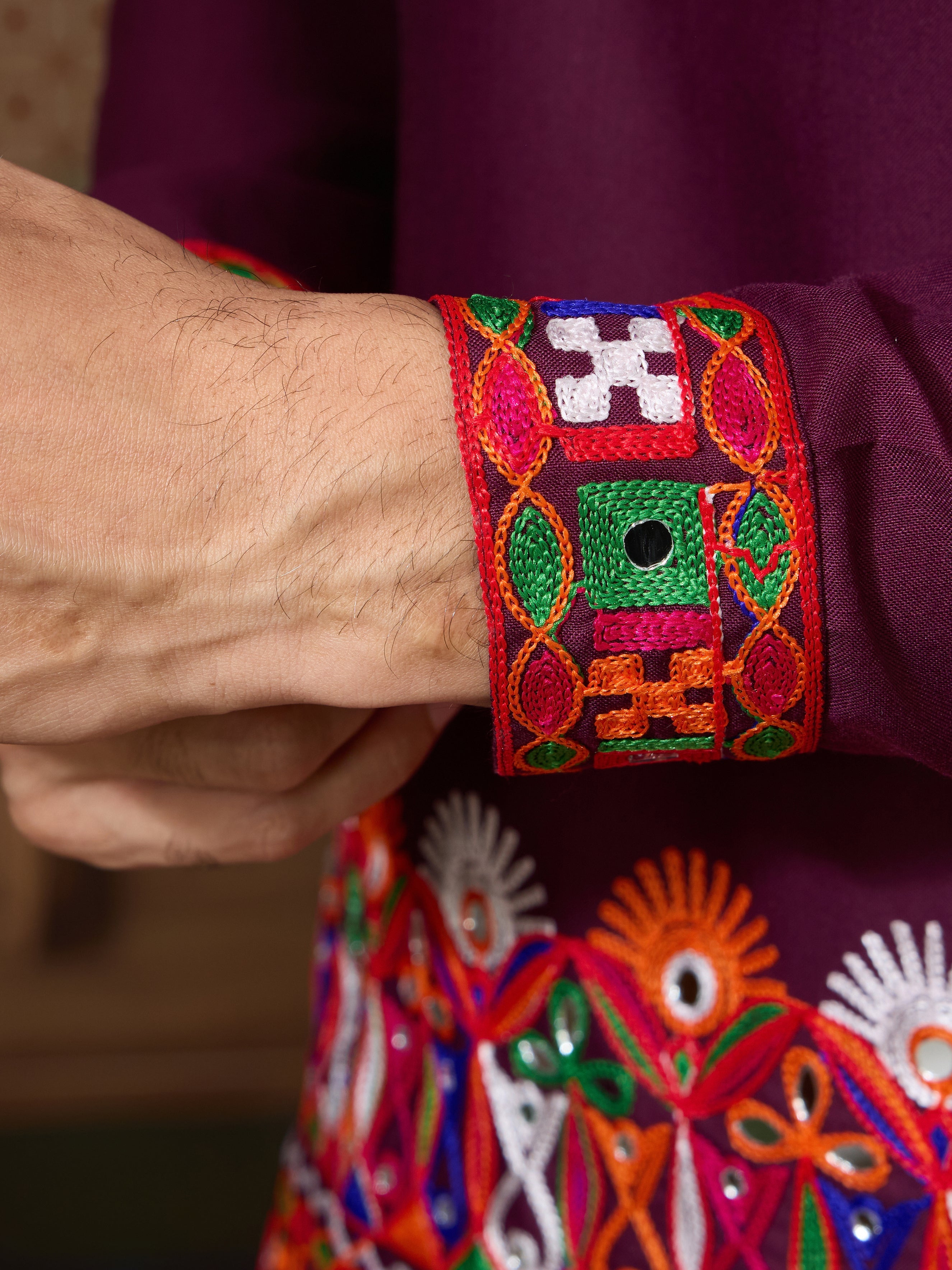 This Ready to Wear Wine Cotton Kurta for Men Features Multi-thread Embroidery With Real Mirror Work, Offering a Detailed and Festive Look That Instantly Draws Attention. The Artistry of the Mirror Work Reflects Light Beautifully, Ensuring That You Stand Out During Evening Events or Garba Nights. Available in Stitched Sizes M, L, Xl, and Xxl, This Kurta Guarantees a Tailored Fit That Complements Different Body Types.