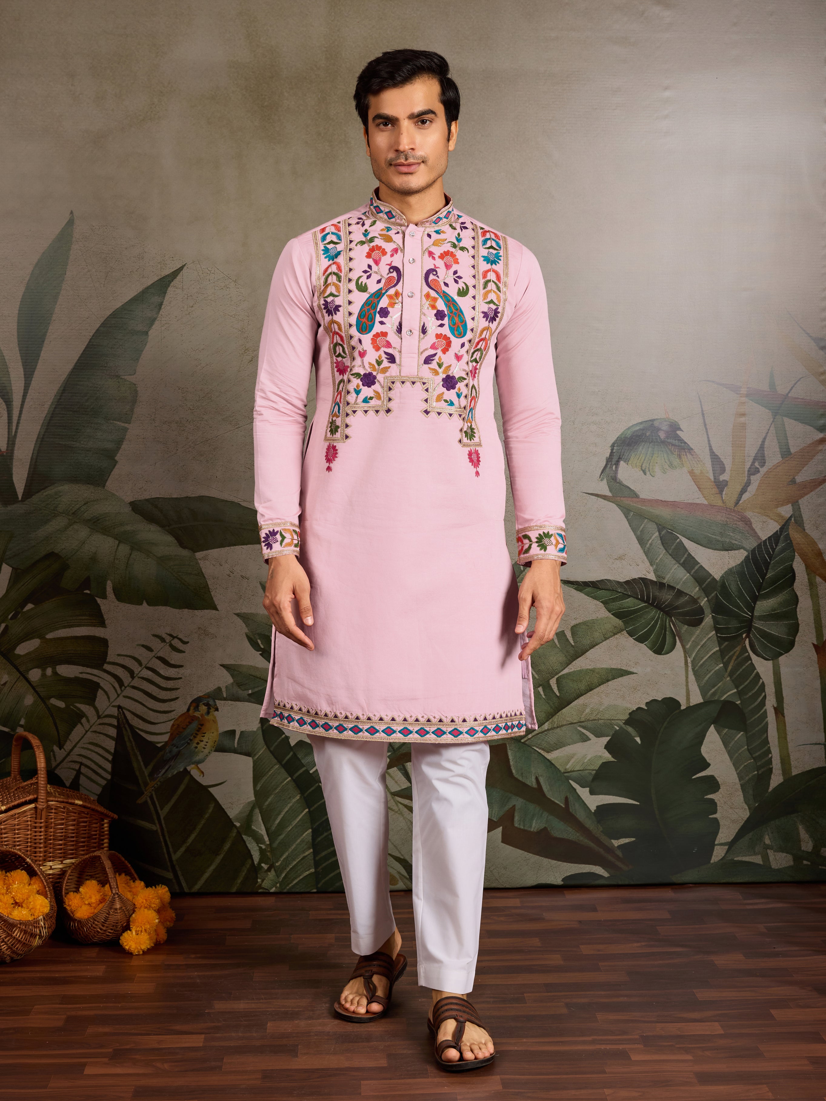 The Pink Stylish Traditional Kurta Mens Design Brings Elegance and Comfort Together in One Classic Ethnic Outfit. Crafted From Premium Viscose Silk Fabric, This Kurta Offers a Luxurious Shine With a Soft Feel Against the Skin.