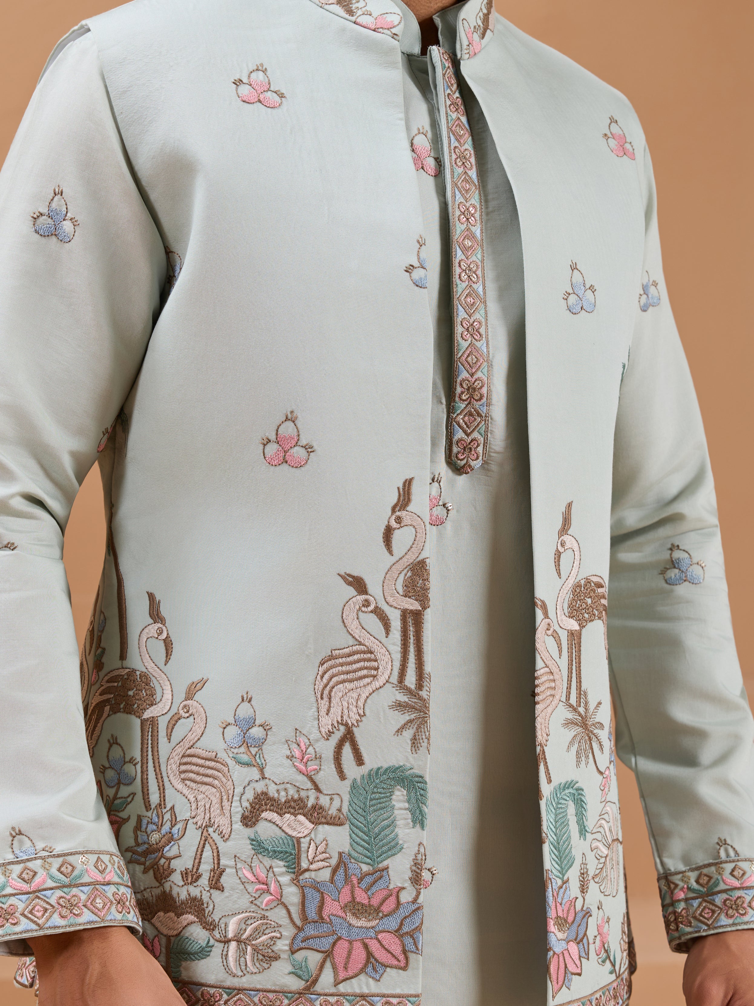 Pista Green Color Embroidered and Sequence Mens Kurta Jacket and Pant Set