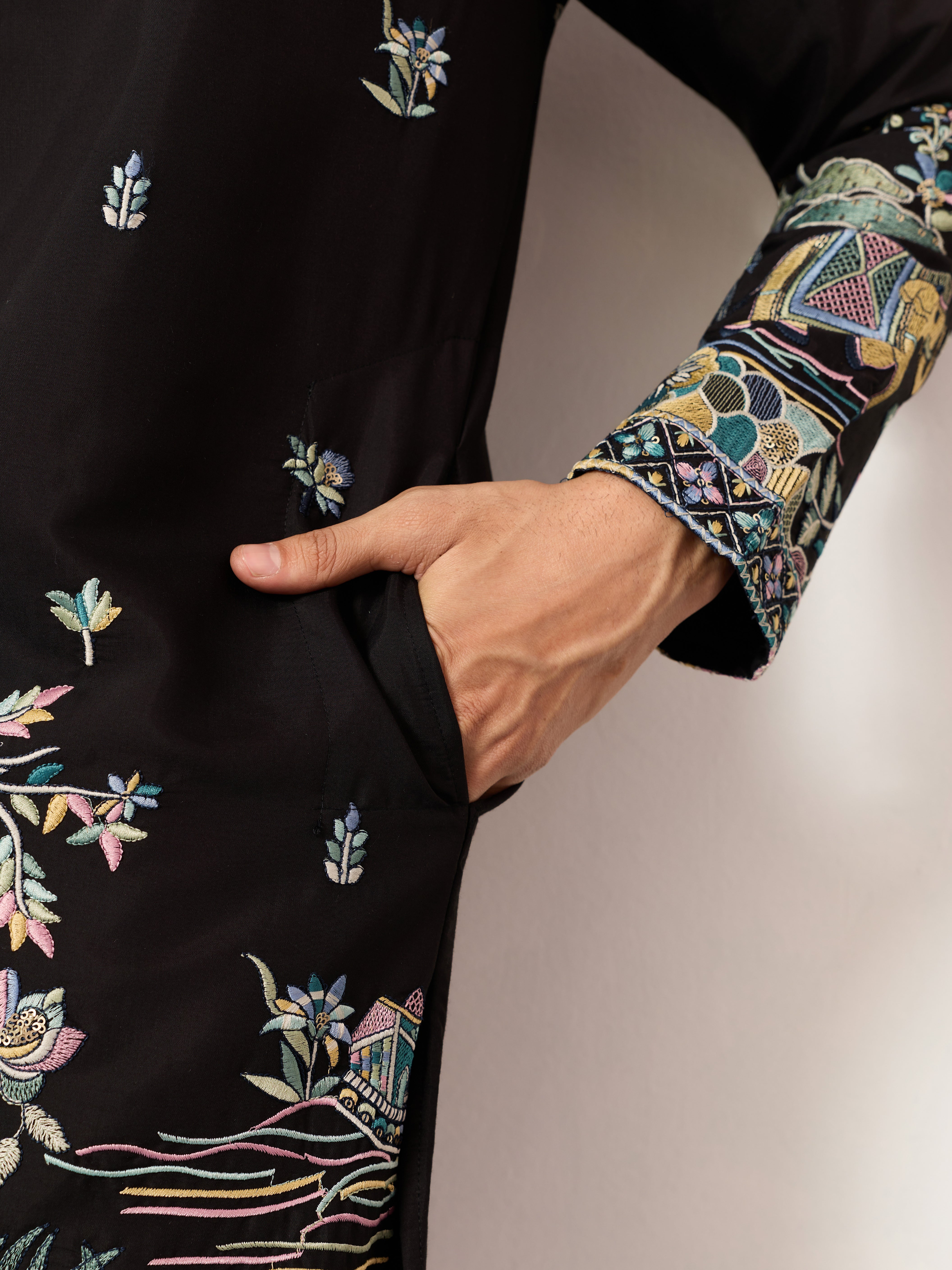 Men Choose This Black Wedding Kurta for Men Because It Delivers Royal Style Without Heavy Effort. The Kurta Includes Fine Thread and Sequence Embroidered Work That Enhances the Ethnic Appeal. The Embroidery Adds Shine While Keeping the Look Elegant and Balanced. The Black Cotton Bottom Matches the Kurta Perfectly and Provides Comfort During Long Celebrations.