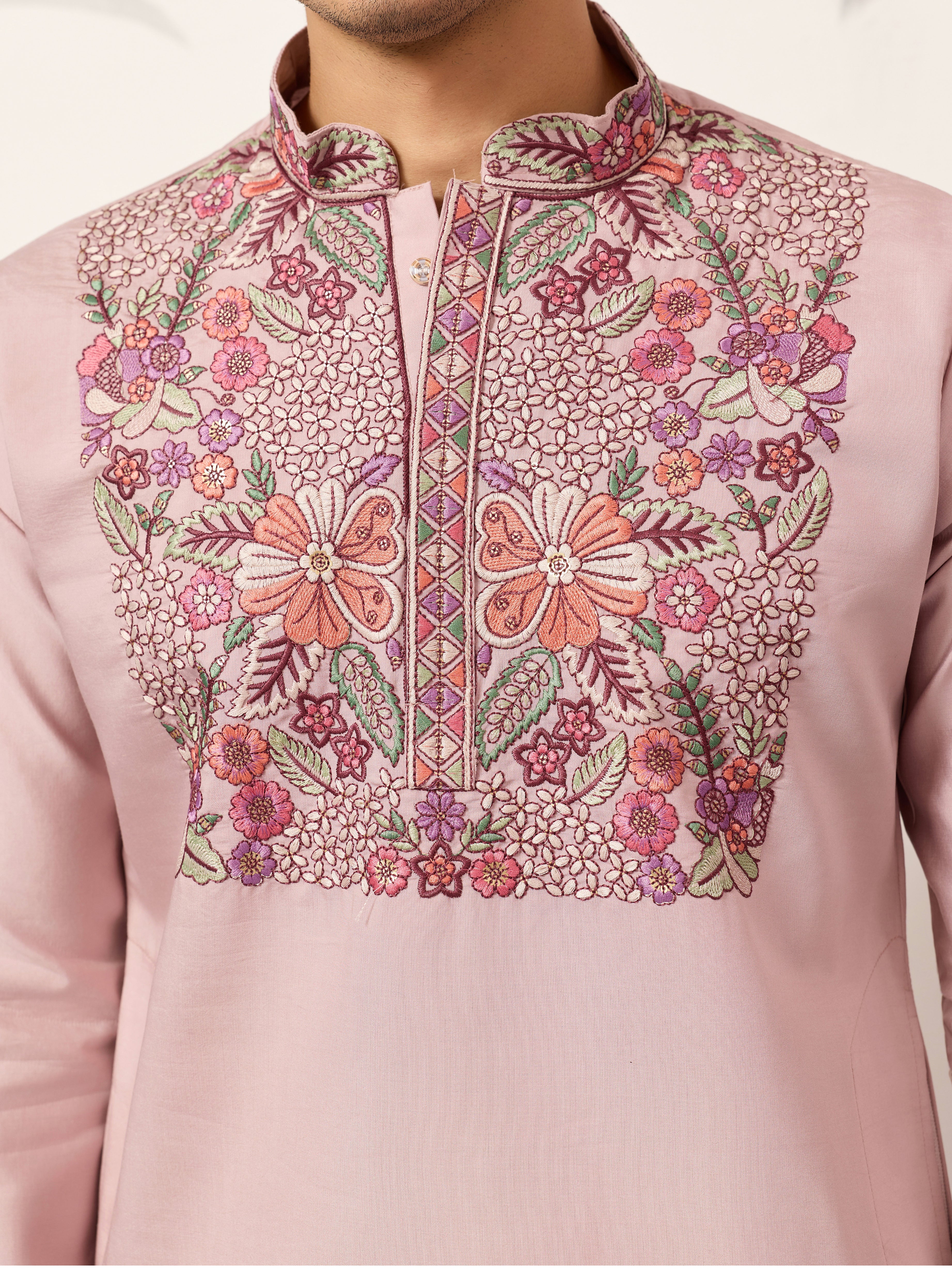 The Stylish Dusty Pink Kurta Pant Set is Designed for Men Who Want a Refined Festive Look With Timeless Ethnic Appeal. Crafted in Premium Viscose Silk Fabric, This Kurta Pant Set Delivers Comfort, Elegance, and Visual Richness for Special Occasions. The Dusty Pink Shade Adds a Modern and Sophisticated Tone, Making This Outfit Suitable for Festivals, Weddings, Family Celebrations, and Cultural Events.